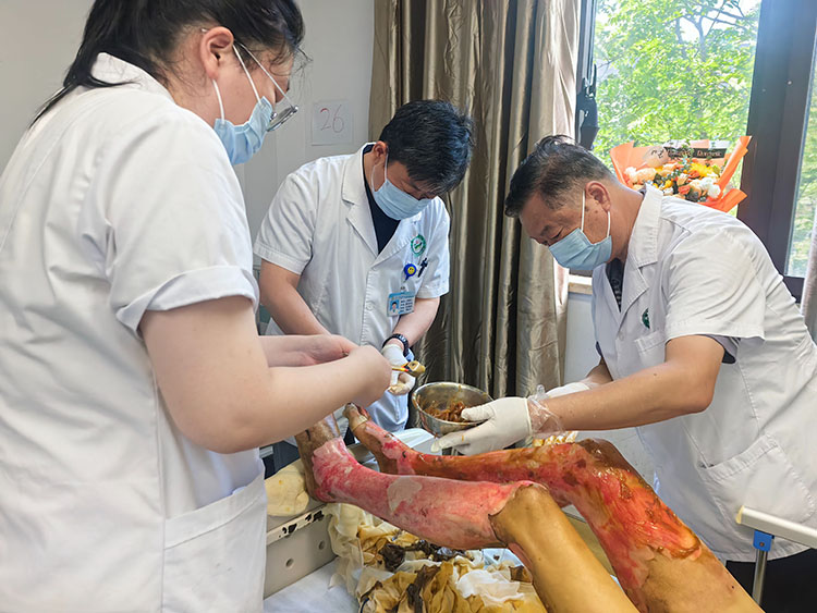 2025年7月8日,中國燒傷創(chuàng)瘍雜志編委,燒傷創(chuàng)瘍再生醫(yī)療技術(shù)臨床專家張強(qiáng),應(yīng)邀前往鳳陽縣人民醫(yī)院,對一例40%多的大面積燒傷病人和一例糖尿病足患者進(jìn)行臨床會診,張強(qiáng)主任親自示范再生醫(yī)療技術(shù)創(chuàng)面清創(chuàng)換藥流程,強(qiáng)調(diào)了換藥過程中的注意事項(xiàng),并與蔣主任交流了綜合治療方案,再生醫(yī)療技術(shù)是中西醫(yī)結(jié)合創(chuàng)面治療的典范,其推廣應(yīng)用將極大造福燒傷及慢性創(chuàng)面患者。