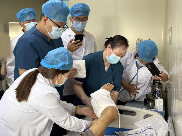 下午,訪問團的成員們分批進入手術室,參觀并參與清創(chuàng)、微粒皮種植等手術,每一個操作細節(jié)的展示都幫助他們將理論知識與實際操作深度結合,有效提升了其對再生醫(yī)療技術相關手術操作規(guī)范的理解與掌握程度,為今后在本國開展同類手術積累了關鍵的實踐經(jīng)驗。觀摩活動結束之后,燒傷整形與創(chuàng)面修復科的醫(yī)生們繼續(xù)帶來了燒傷再生醫(yī)療技術治療壞死性筋膜炎、燒傷再生醫(yī)療技術救治糖尿病足臨床實踐效果的經(jīng)驗分享,并在分享結束后與蒙古國的醫(yī)護就兩國在再生醫(yī)療技術上的差異和不同經(jīng)驗展開了深入交流。通過對比兩國在患者體質、診療環(huán)境、醫(yī)療資源配置等方面的差異,共同探討了技術本土化調整的可行路徑,為再生醫(yī)療技術在蒙古國的優(yōu)化提供了重要參考。