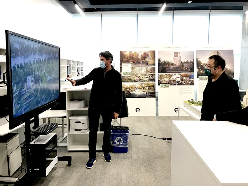 此外,奧巴馬總統(tǒng)中心項(xiàng)目的設(shè)計(jì)師和主管結(jié)合沙盤(pán)和三維動(dòng)畫(huà)向徐鵬介紹了項(xiàng)目的設(shè)計(jì)和軟硬件建設(shè)進(jìn)程。盡管受到疫情影響,奧巴馬總統(tǒng)中心仍將計(jì)劃于2025年竣工。