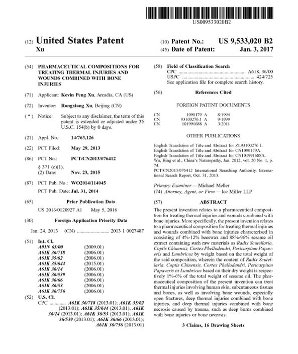 2017年1月3號(hào),徐榮祥教授“治療熱力損傷、創(chuàng)傷合并骨損傷的藥物組合物”獲得美國(guó)專(zhuān)利授權(quán),專(zhuān)利號(hào)US 9,533,020 B2。