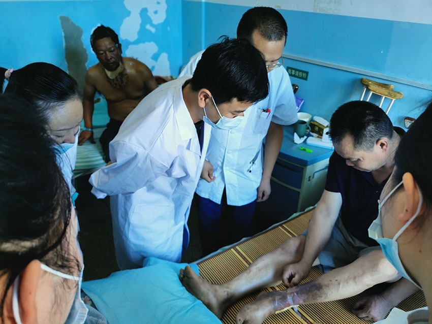 9月15日,享受國務(wù)院特殊津貼專家、中國中西醫(yī)結(jié)合燒傷專業(yè)委員會顧問、中國研究型醫(yī)院學(xué)會創(chuàng)面防治與損傷組織修復(fù)專業(yè)委員會委員、中國中西醫(yī)結(jié)合學(xué)會再生醫(yī)療技術(shù)委員會創(chuàng)瘍學(xué)組首席專家、《中國燒傷創(chuàng)瘍雜志》常務(wù)編委、成都市郫都區(qū)人民醫(yī)院燒傷創(chuàng)瘍科學(xué)術(shù)帶頭人付子俊教授再次應(yīng)黔西林東醫(yī)院(燒傷??漆t(yī)院)的邀請,對一例大面積特重度燒傷病人進行救治,并親自示范清創(chuàng)術(shù),耕耘術(shù),換藥,并細(xì)致講解規(guī)范化治療,后在科室進行了治療方案的討論。