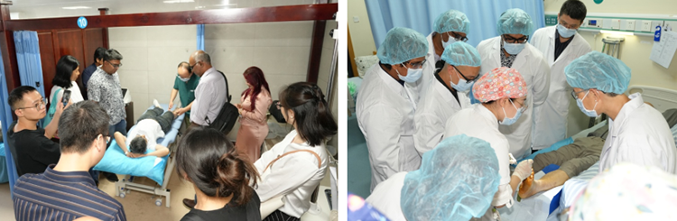 9月16日,代表團首站訪問湖南中醫(yī)藥大學(xué)第二附屬醫(yī)院。醫(yī)院黨委副書記游柏穩(wěn)代表院方致歡迎辭。隨后,皮膚中心創(chuàng)面修復(fù)科副主任田毅與侯玉潔醫(yī)生分別就典型病例進行了分享,以深入淺出的方式介紹了再生醫(yī)療技術(shù)在創(chuàng)面管理中的應(yīng)用機制,使代表團對該技術(shù)有了更深入的理解。分享結(jié)束后,代表團前往針灸推拿康復(fù)中心,參觀并親身體驗了針灸、閃罐等傳統(tǒng)中醫(yī)治療方法。隨后,代表團走進創(chuàng)面修復(fù)科病房,現(xiàn)場觀摩了應(yīng)用再生醫(yī)療技術(shù)為糖尿病足及放射性皮炎患者規(guī)范換藥的全過程,并就放射性皮炎在創(chuàng)面處理中的難點與關(guān)鍵治療環(huán)節(jié)進行了交流。參觀環(huán)節(jié)結(jié)束后,雙方專家再度座談,圍繞慢性創(chuàng)面治療的最新進展、中馬兩國醫(yī)療體系的差異等議題展開了深入討論。