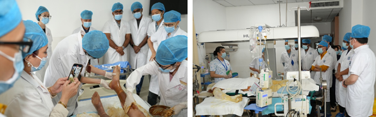 9月18日,代表團赴瀏陽市開展醫(yī)療交流,先后訪問了瀏陽市中醫(yī)院與瀏陽市人民醫(yī)院。兩家醫(yī)院在再生醫(yī)療技術(shù)臨床應(yīng)用方面均擁有深厚積累,尤其在大面積燒傷綜合救治領(lǐng)域成效顯著。當日上午,代表團首先到訪瀏陽市中醫(yī)院,在燒傷科主任朱樹昌的陪同講解下,代表團實地了解到了翻身床、懸浮床、紅外線照射等設(shè)備在大面積燒傷治療中的輔助應(yīng)用,并就中西醫(yī)結(jié)合模式在提升創(chuàng)面修復(fù)效果與患者滿意度方面的實踐路徑,進行了深入交流。下午,代表團轉(zhuǎn)赴瀏陽市人民醫(yī)院。周明亮院長結(jié)合典型病例,系統(tǒng)介紹了該院將大面積燒傷創(chuàng)面的治療經(jīng)驗轉(zhuǎn)化應(yīng)用于慢性難愈合創(chuàng)面的臨床策略與關(guān)鍵技術(shù)。隨后,皮膚醫(yī)學(xué)中心主任蔣章佳與燒傷重建創(chuàng)面修復(fù)科主任焦獻功共同展示了獲專利認證的醫(yī)院自研設(shè)備——磨痂器及環(huán)鉆治療術(shù),借助臨床案例生動演示了該技術(shù)在處理大面積燒傷創(chuàng)面、慢性難愈合創(chuàng)面及瘢痕綜合管理中的顯著療效。訪問期間,代表團還與兩院醫(yī)護人員圍繞再生醫(yī)療技術(shù)的規(guī)范化實施、治療流程優(yōu)化及植皮手術(shù)操作要點等議題,開展了廣泛而專業(yè)的座談交流。
