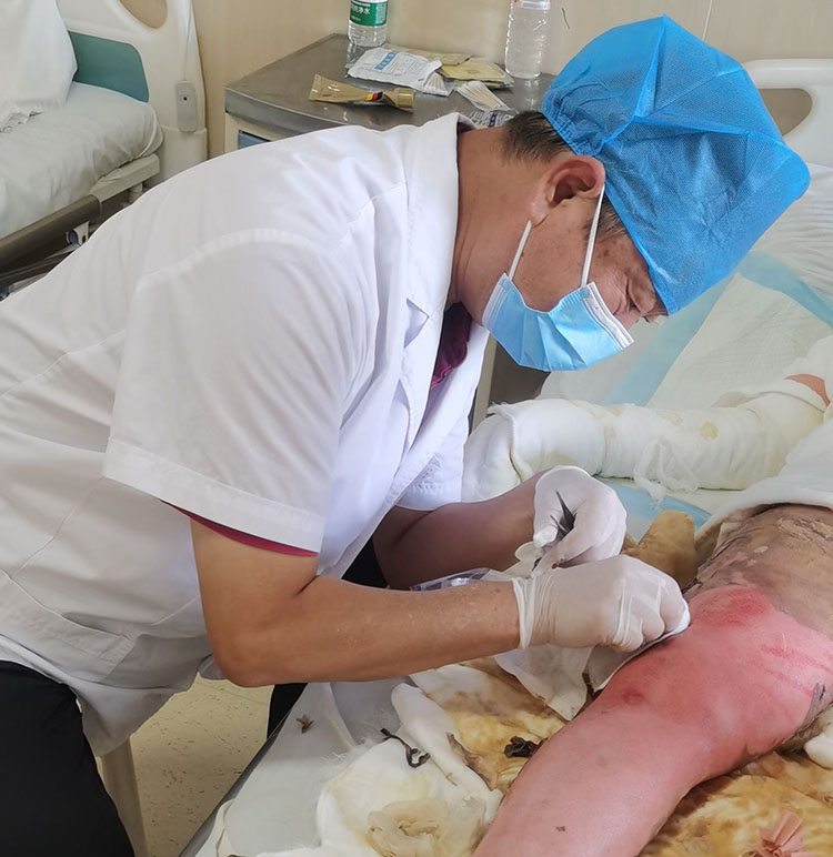 8月18日,應河北魏縣中醫(yī)醫(yī)院之邀,再生醫(yī)學知名專家、《中國燒傷創(chuàng)瘍雜志》常務編委趙瑞慶主任,在該院會診了三例創(chuàng)面患者(下肢外傷皮膚深部感染、腦出血合併巨大壓瘡、肢體多部位瀝青燒傷),并親自演示了操作程序,在討論環(huán)節(jié)提供了一對一的治療方法。