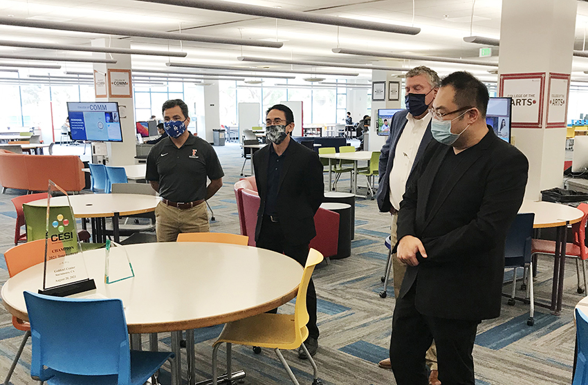 當?shù)貢r間10月8日,美寶集團董事局主席徐鵬攜洛杉磯周刊(LA Weekly)CEO Calle應(yīng)邀參觀考察了加州州立大學富勒頓分校電競項目及電競團隊。加州州立大學富勒頓分校校長Fram Virje(在線)、副校長 Greg Saks在校園現(xiàn)場熱情接待了徐鵬一行。校長Fram Virje特別介紹了該校,表示富勒頓分校是整個加州學生數(shù)量最多的公立大學,并對徐鵬對學校的支持及學生的指導(dǎo)表示了感謝。Saks副校長特意帶領(lǐng)徐鵬一行參觀了富勒頓分校圖書館電競中心,該校電競隊伍今年斬獲了薩科拉門托國王隊主場體育館舉行的電競比賽冠軍。