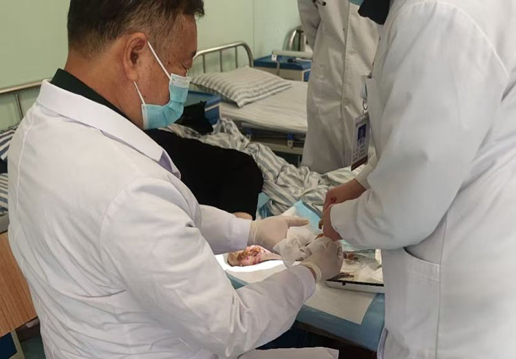 3月11日,應(yīng)湖南省懷化市芷江侗族自治縣人民醫(yī)院造口門診向海英護(hù)士邀請(qǐng),《中國(guó)燒傷創(chuàng)瘍雜志》編委、燒傷創(chuàng)瘍?cè)偕t(yī)療技術(shù)臨床專家金黨軍,到科室會(huì)診嚴(yán)重糖足患者,金黨軍主任親自示范原位再生醫(yī)療技術(shù)換藥流程,強(qiáng)調(diào)了換藥過(guò)程中的禁忌和注意事項(xiàng),并傳授了綜合治療方案。再生醫(yī)療技術(shù)在湖南省湘西地區(qū)基層醫(yī)療單位逐漸擴(kuò)大普及和應(yīng)用,為廣大燒傷創(chuàng)瘍患者帶來(lái)了福音。