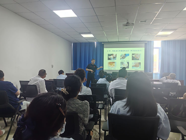 5月28日,《中國燒傷創(chuàng)瘍雜志》常務(wù)編委、燒傷創(chuàng)瘍再生醫(yī)療技術(shù)臨床專家趙瑞慶,應(yīng)邀在溧水區(qū)人民醫(yī)院舉辦了一期再生技術(shù)科室培訓,講解了《再生技術(shù)治療糖尿病足潰瘍》《再生技術(shù)救治急性外傷創(chuàng)面的臨床使用》講座,在會上解答了大家提出諸多的臨床問題。會后深入病區(qū)會診了二例慢創(chuàng)患者,本次再生技術(shù)走基層活動受到當?shù)蒯t(yī)務(wù)人員的熱情稱贊。
