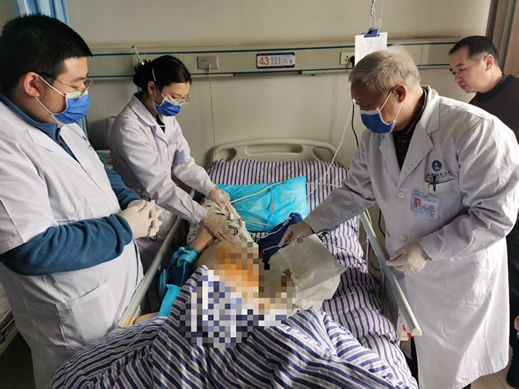 2025年2月19日,《中國(guó)燒傷創(chuàng)瘍雜志》編委、燒傷創(chuàng)瘍?cè)偕t(yī)療技術(shù)臨床專(zhuān)家張強(qiáng),到訪國(guó)藥葛洲壩中心醫(yī)院醫(yī)養(yǎng)結(jié)合病區(qū)及老年醫(yī)學(xué)病區(qū),會(huì)診三例高齡壓瘡患者創(chuàng)面及一例輸液外漏致皮膚壞死創(chuàng)面患者。張主任對(duì)創(chuàng)面應(yīng)用再生技術(shù)換藥效果予以肯定,與吳護(hù)士長(zhǎng),趙護(hù)士長(zhǎng)等對(duì)患者營(yíng)養(yǎng)、創(chuàng)面處理小技巧做了有效溝通,得到醫(yī)護(hù)人員高度認(rèn)可。