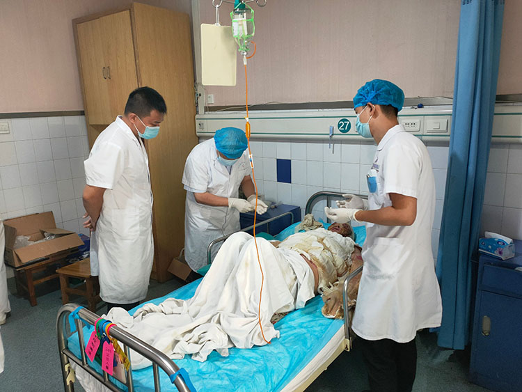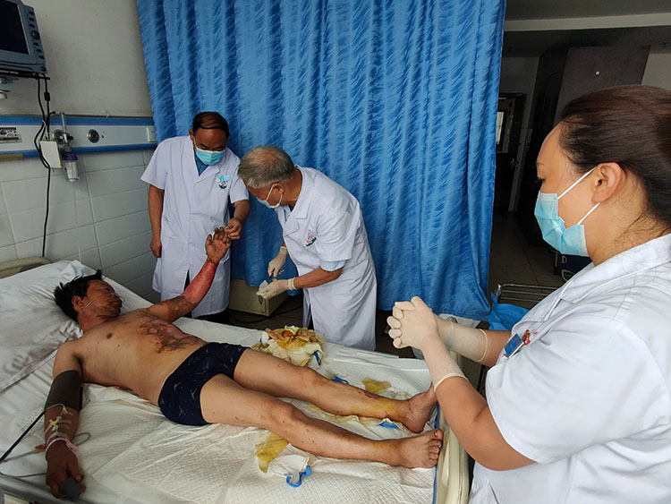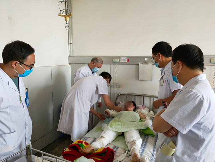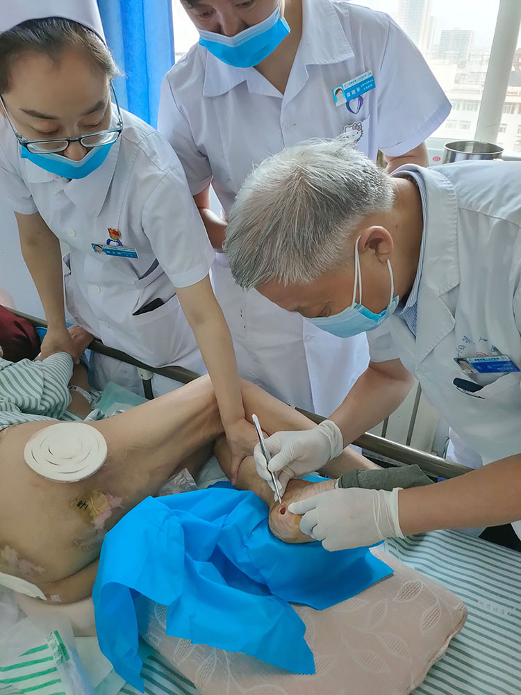 13日,金教授來(lái)到洛陽(yáng)第十人民醫(yī)院創(chuàng)面修復(fù)科,對(duì)科室收治的糖尿病液化氣爆炸傷病人進(jìn)行查房換藥,對(duì)科室的燒傷治療效果給予肯定。