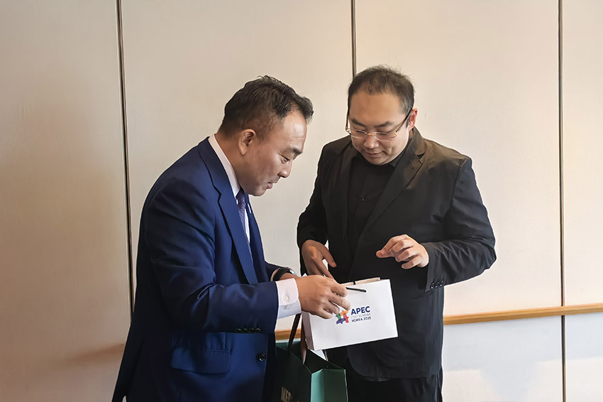 會后,雙方互贈具有深厚APEC淵源的紀念禮品。 李成宇副會長向徐鵬主席贈送了韓國2025年APEC領導人峰會官方紀念幣套裝。徐鵬主席則回贈了美寶燒傷膏(韓國在售版本)以及MIAGE高端護膚品套裝。這兩份回贈禮品均承載著往屆APEC的印記:MIAGE產品是2023年美國舊金山APEC領導人峰會官方禮品袋的重要成員;而美寶燒傷膏則是2024年秘魯利馬APEC領導人峰會的官方禮品之一。此次互贈,不僅體現了雙方的情誼,更巧妙地串聯起歷屆APEC峰會的深厚淵源。
