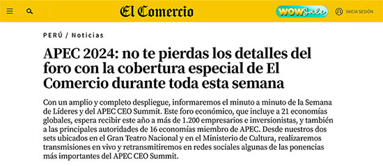 備受矚目的2024年亞太經(jīng)合組織(APEC)CEO峰會(huì)即將于11月13日至15日盛大啟幕。針對(duì)此次峰會(huì)為期數(shù)天的豐富議程,當(dāng)?shù)貦?quán)威媒體《秘魯商報(bào)》(El Comercio)已率先進(jìn)行了報(bào)道。以下是相關(guān)譯文及詳細(xì)鏈接: