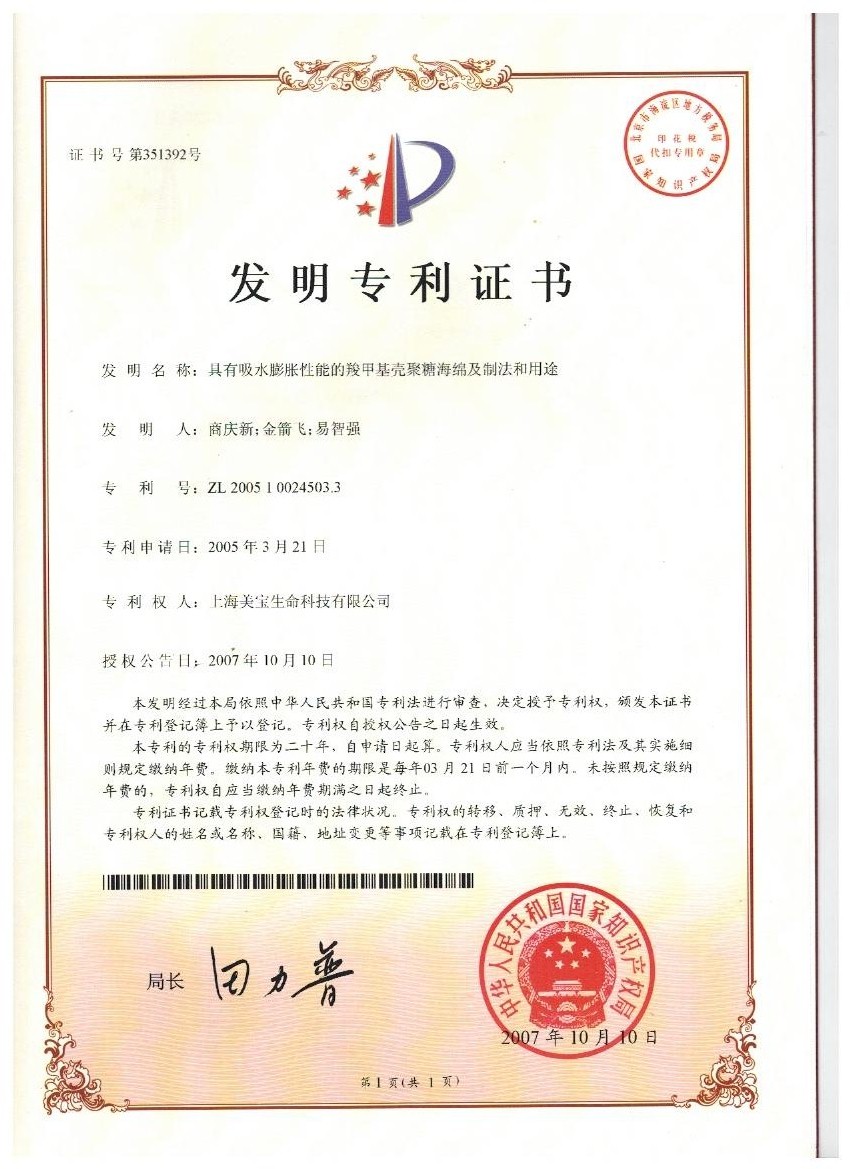 | ZL200510024503.3 | 具有吸水膨脹性能的羧甲基聚糖海綿及制法和用途 | 查看 |